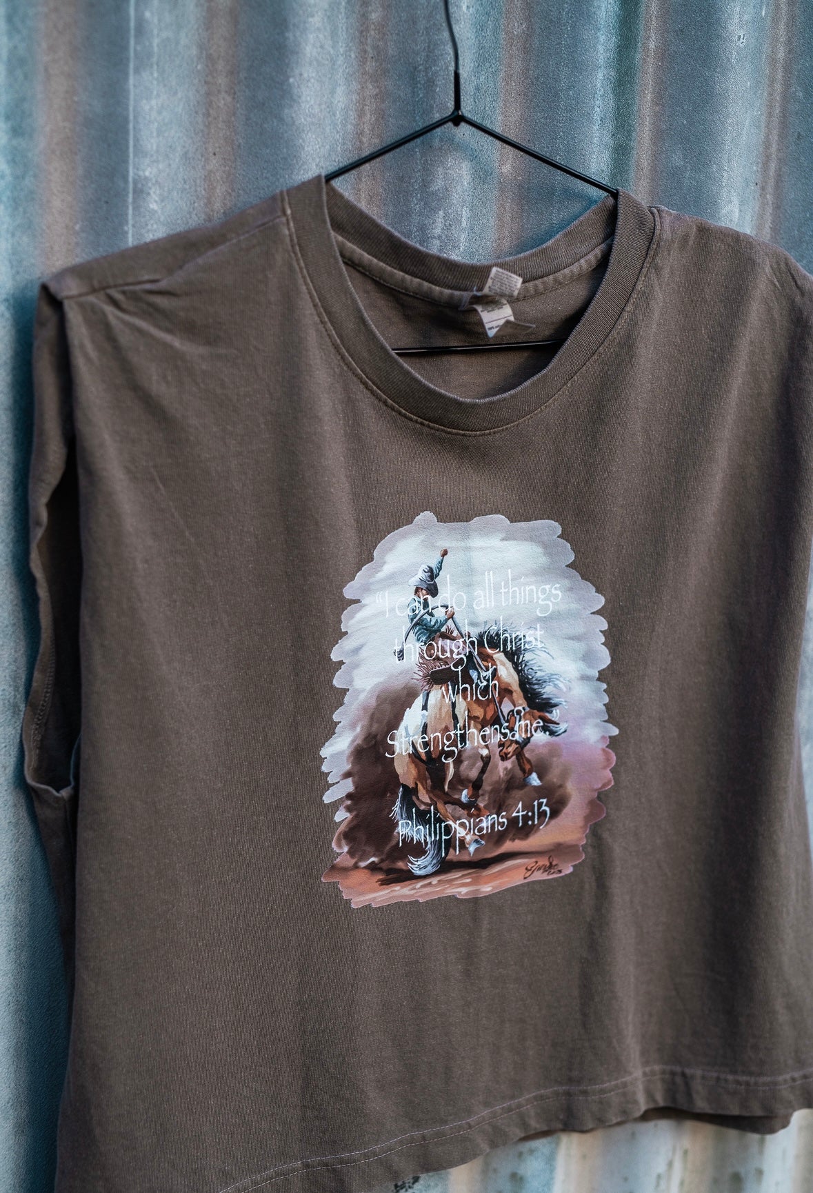 Brown coloured tank top featuring original art by Miss Jonesy Finearts and scripture from Philippians.