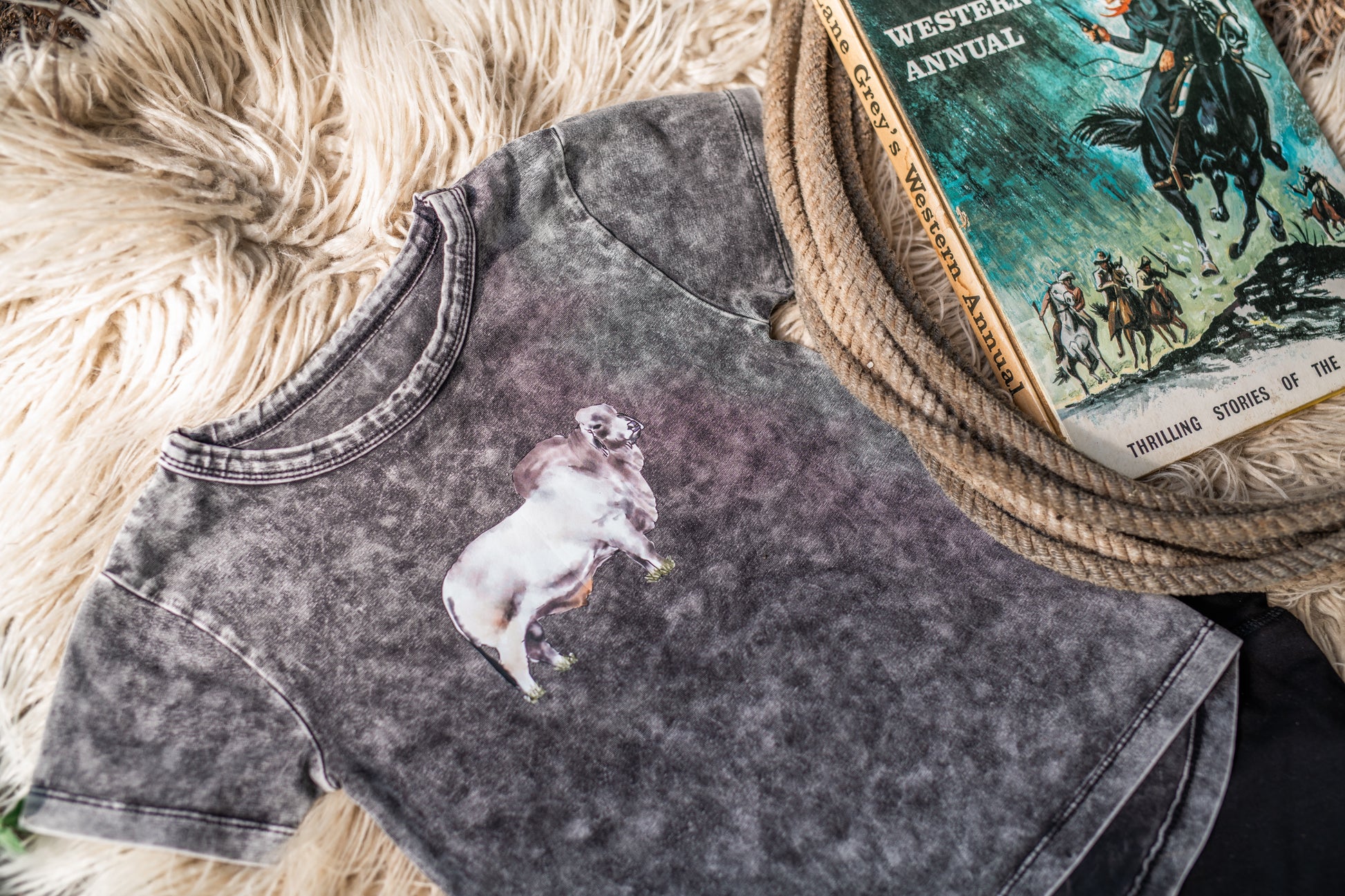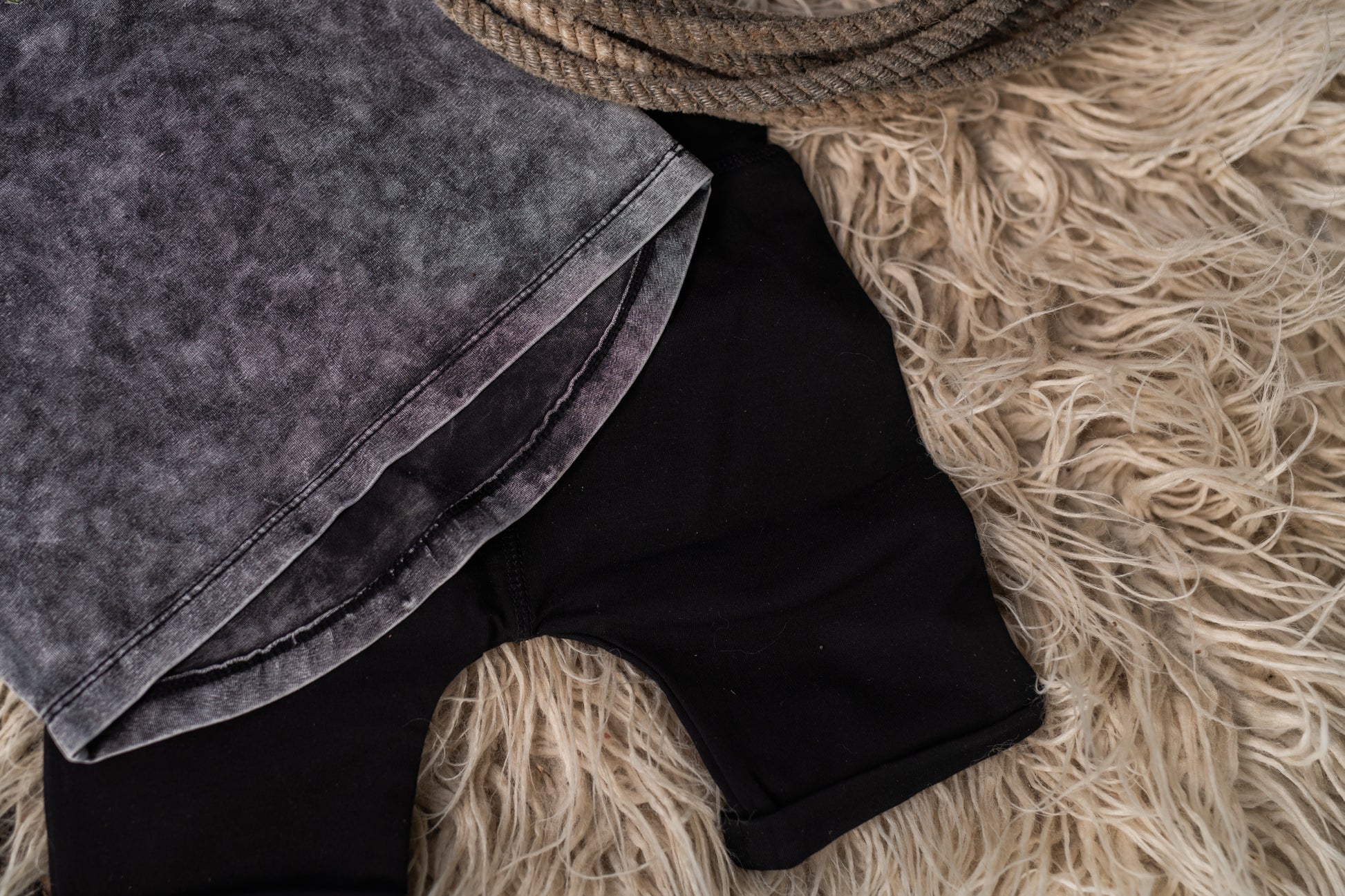 Little boys stone wash shirt featuring Brahman bull design and black 3/4 length shorts.